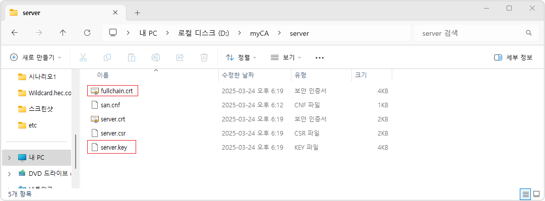 - 생성된 fullchain.crt 인증서와 server.key 키를 활용하여 웹 서버의 통신간 암호화 용도로 사용할 수 있다.