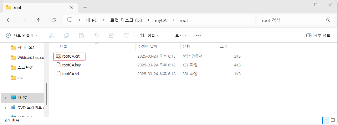 PS D:\myCA> openssl req -x509 -new -key root\rootCA.key -sha256 -days 3650 -out root\rootCA.crt -subj "/C=KR/O=MyRootCA/CN=MyRootCA"